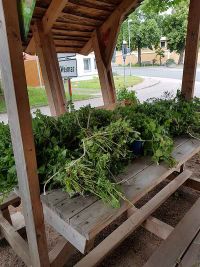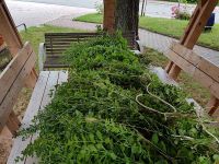 Mit dem Rückschnitt der Weinreben am Weihhang ging die Ernte der Minze einher. Auch diese war wegen der feuchten Witterung üppig gewachsen und konnte daher am 2. und 3. Juli in dicke Bündel geschnürt werden, um sie dann unter dem Dach der Minzebank aufhängen und trocknen zu können.