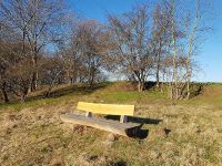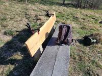 Wir hatten im Herbst 2020 Bänke angeschafft, die in unserer Flur aufgestellt worden waren, damit man sich an besonderen Stellen auch einmal ausruhen kann. An einer dieser Stellen stand schon früher einmal eine Bank. Von ihr waren nur noch die Reste der Betonhalterung der Rückenlehne übrig geblieben. Der Halbstamm war damals vor diese Überreste gestellt worden, damit später eine Lehne montiert werden konnte. Die Lehne war damals bereits angeschafft worden. Sie wurde von den Rindenresten befreit, gehobelt, geschliffen und geölt. Jetzt sollte sie am 13. März 2022 montiert werden. Der Tag war wie geschaffen dafür, lachte doch die Sonne von einem blauen Himmel herab. Das Werkzeug und etwas Proviant wurden mit einem Zweiräder zur Bank gefahren und die Arbeiten konnten beginnen.
