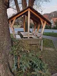 Die noch immer winterlich geschmückte Minzebank fing nun langsam an zu stacheln. Grund dafür waren die mittlerweile trockenen Tannennadeln der von uns dort angebrachten Zweige. Es war also allerhöchste Zeit die Minzebank (und uns) davon zu befreien. Schließlich ging es auf Ostern zu und es sollte ringsum etwas österlicher aussehen. Am 19. März 2022 war der Tag des Abschmückens herangerückt. Die Lichterketten wurden aufgerollt und die Zweige auf einen Stapel gelegt.