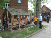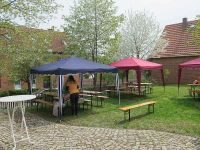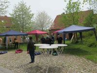 Nach zwei Jahren Pause war es wieder einmal an der Zeit, die bunten Bänder im Frühlingswind flattern zu lassen. Nachdem schon vor Tagen der Maikranz gebunden worden war, sollte er nun auch am Maibaum befestigt und mit samt dem Maibaum aufgestellt werden. Wir hatten uns dazu entschlossen, im Hof des Bürgerhauses die Pavillons aufzustellen.