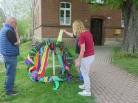 Während im Hof der Rost vorgeglüht wurde, war es endlich an der Zeit, den Kranz und den Maibaum aus dem Museum zu holen und miteinander zu verbinden. für die Spitze lagen außerdem noch Birkenzweige bereit, welche noch mit Bändern bestückt werden mussten. Es gab also noch allerhand zu tun.