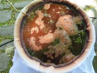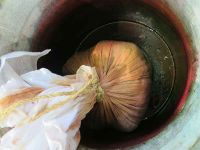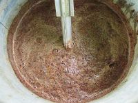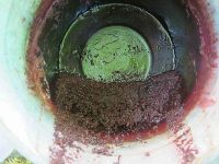 Der Sud wurde dann mit Tüchern gefiltert und der Satz des eingeweichten Krapps mit im Tuch fest verknotet und zu der zu färbenden Wolle in das Farbbad gegeben. Die Wolle wurde natürlich vorher aus der Beize genommen und ausgespült.