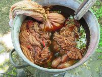 Am 10. Mai, also am Tag darauf wurden die gehäckselten Krappwurzeln eingeweicht und kurz aufgekocht und dann für zwei Tage ziehen gelassen.