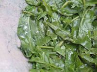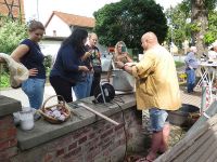 Vorher galt es jedoch, wie auch in früheren Zeiten, den Waid zu waschen, damit möglichst viele Verunreinigungen abgespült und aussortiert werden konnten. Mit dem Waid waren natürlich auch so manche Unkräuter dem Waideisen zum Opfer gefallen. Immer eine handvoll Blätter wurden so gewaschen und anschließend auf Unkräutern durchsucht. Die Waidblätter landeten zum Abtropfen im Korb und die Unkräuter daneben. Inzwischen war in einem Kessel Wasser zum Kochen gebracht worden. In einem anderen Kessel wurden nun die gewaschenen Waidblätter gerupft, also mit den Händen zerrissen und zerkleinert. Über diese Blattfetzen wurde anschließend das kochende Wasser gegossen. Ab jetzt galt es abzuwarten. Der Kessel mit Inhalt ruhte nun etwa zwei Stunden.