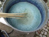 Die auf etwa 60 °C abgekühlte Brühe mit den Blättern konnte nun, nach zwei Stunden durch ein Tuch abgegossen werden. Das braune Wasser schillerte hier und da bereits bläulich, sobald es Blasen bildete. Im Anschluss kam der Topf wieder auf die Heizplatte, denn die Temperatur sollte bei 55 bis 60°C gehalten werden. Praktisch dafür sind die alten DDR-Einkochtöpfe mit Lochdeckel und Thermometer. Jetzt kam Natron in die Küpe und Sauerstoff wurde untergerührt, dass der Schaum, der sich bildete kräftig blau leuchtete. Der blaue Indigo hat sich nun gezeigt und flockt in der Küpe aus. Der Sauerstoff soll nun wieder der Flüssigkeit entzogen werden. Man reduziert mit Natriumdithionit. Gleich, nachdem die Kristalle auf den Schaum treffen, verfärbt sich dieser in einen dunklen Blauton. Vorsichtig wird gerührt und der Schaum löst sich vollkommen auf. Die Küpe wird zunächst grünlich und dann gelblicher. Dies ist ein Zeichen, dass man mit dem Färben beginnen kann.