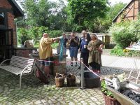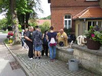 Da der Bürgerhaus-Hof aus Sicherheitsgründen abgesperrt war, verlagerten wir den Färbetag unter die beiden Kastanien vor dem Bürgerhaus an der Minzebank. Die Gäste waren 14.00 Uhr eingetroffen, wie auch einige Einwohner von Hochstedt, die dem Bratwurstduft nicht widerstehen konnten. Es gab auch Kaffee und sogar ein Stück Kuchen. Bei milder Witterung und trockenem Himmel konnte die Färberei beginnen.