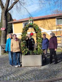 Die Frauen vom Frauentreff hatten sich am 16. März 2023 getroffen, um die Osterkrone am Lindenborn aufzubauen und zu schmücken. Diesmal wurde oben auf der Krone ein gehäkelter Osterhase angebracht, den eine der Frauen selbst für diesen Zweck hergestellt hatte.