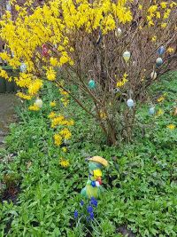 Auch an anderen Stellen, rings um das Bürgerhaus sah man, dass Ostern nicht mehr weit war. Ein besonderer Osterschmuck war der Tannenbaum, der vor Monaten als Weihnachtsbaum in die Hülse vor dem Bürgerhaus gestellt worden war. Er sah noch so frisch aus, dass er kurzerhand mit Ostereiern behangen und nun als Osterbaum weiterleben konnte.