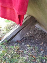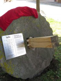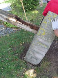 Bereits Anfang des Jahres war sichtbar geworden, dass der Balken im Waidmühlstein Am Lindenborn nicht mehr lange durchhalten würde. Seit dem Frühjahr waren deshalb Kostenangebote für einen neuen Eichenbalken eingeholt worden. Immerhin ging es um 16 x 16 cm in´m Querschnitt und eine Länge von 150 cm. Der Balken sollt unbedingt bis zum Waidfest, am 7. September, ersetzt werden. An einem Sonntag (11. August) war es dann soweit. Ein Kleinbagger war organisiert, der den Stein vorsichtig drücken sollte, damit der Balken getauscht werden konnte.