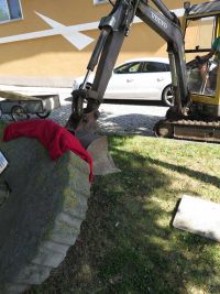 Zum Schutz des Steines war eine Wolldecke darauf ausgebreitet worden. Das Anschieben des Steins stellte für den Minibagger kein Problem dar so dass der Balken problemlos getauscht werden konnte.