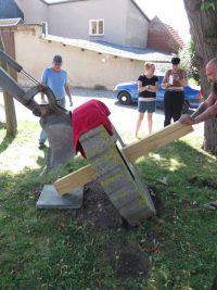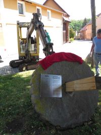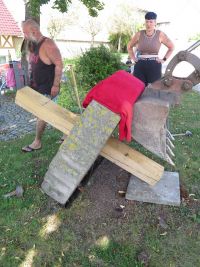 Nach einer kleinen Korrektur und einer Drehung des Steins war mit dem Verkeilen des Balkens und den abschließenden Erdarbeiten das Projekt "Balkenwechsel" abgeschlossen - übrigens fast auf den Tag genau nach 15 Jahren seiner erstmaligen Aufstellung (28.08.2009).