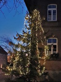 Nachdem der Baum fest in seiner Hülse verkeilt war, konnte es ans Schmücken gehen. Zuerst waren die Lichterketten dran und später die Kugeln und Schleifen.