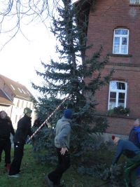 Dort wurde der Baum vom Hänger geladen und vorsichtig an seinen endgültigen Standort gebracht.