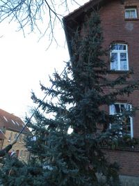 Die Blautanne, die der Weihnachtsbaum werden sollte stellte sich als Zwillingsbaum dar - hatte also zwei Spitzen, die sich bereits weit unten am Stamm gabelten. Um den mächtigen Baum erst einmal auf die Straße zu bekommen, mussten die Weihnachtsbaumwichtel vom Traktor unterstützt werden.
