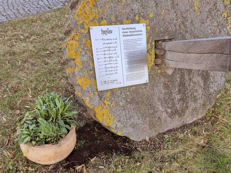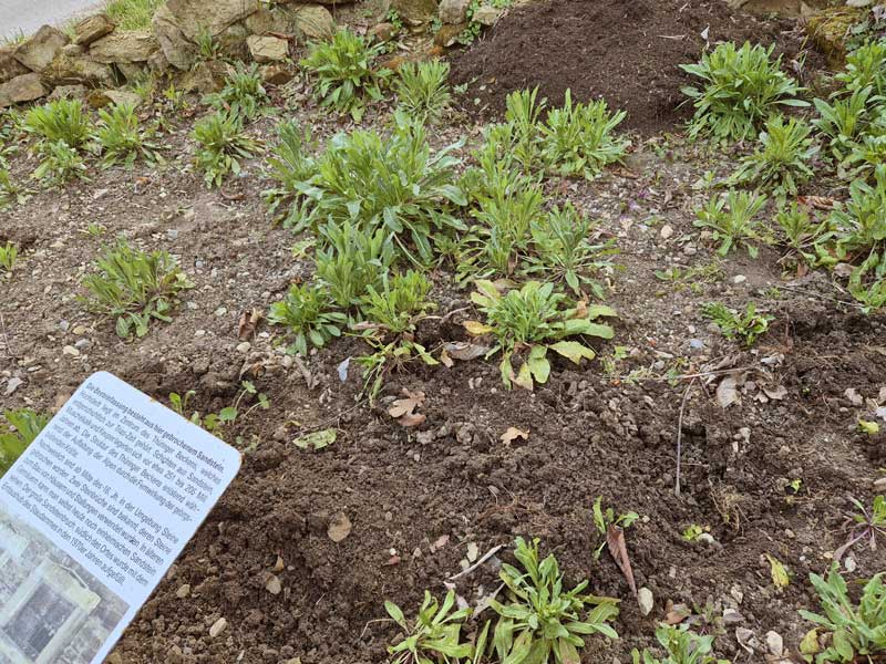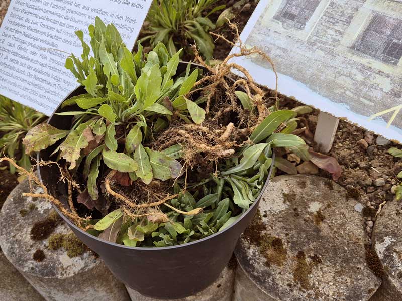 Das Waidbeet wurde in diesem Jahr ziemlich spät in Angriff genommen. Es hatte bereits viele milde Tage gegeben und der Waid vom letzten Jahr begann bereits seinen Blütenstängel auszutreiben. Es war also höchste Zeit für das Umsetzen der Waidpflanzen, wenn man sie nicht entsorgen wollte. Wie immer sollte ein Teil der Pflanzen auf dem Beet zur Blüte kommen und Samen ausbilden. Dafür waren die Waidpflanzen am Rande des Beetes gedacht. Die anderen wurden in Kübel umgesetzt und am Waidstein eingetopft, wo sie blühen sollten. Es ging also am 20. März 2026 (Frühlingsanfang) an die Arbeit und damit an das Ausgraben der Pflanzen damit später umgegraben und neu ausgesät werden konnte.