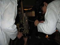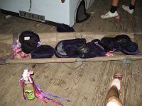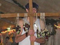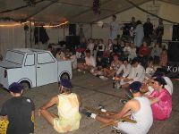 Da alles einmal zuende geht, gilt das natürlich auch für die Kirmes in Hochstedt. Wie immer wird die Kirmes beerdigt und die Gesellschaft zieht ein letztes Mal in das Zelt ein. Mit Nachthemden bekleidet und Kerzen in der Hand - in diesem Jahr sogar mit einem Trabant - ging es vor zur Bühne. Dort ließ man sich rings um das Gefährt des  Kirmnesvaters nieder und wartete bis es im Publikum mucksmäuschenstill war.