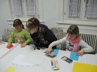 Oben, im Freizeittreff war alles zum Bemalen der Kalenderblätter vorbereitet und die Knirpse machten sich sogleich an die Arbeit. Schnell füllte sich Blatt für Blatt. Unter jedes Kunstwerk wurde der Name des Kindes geschrieben und damit kenntlich gemacht, wer da gemalt hat.