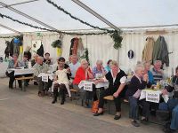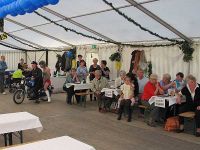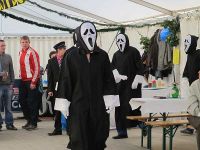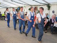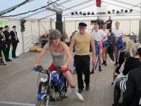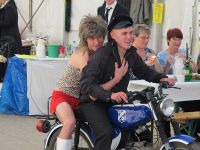 Kurz darauf rollte ein Moped ins Zelt, mit einem jungen Pärchen darauf. Die Blaumänner hatten sich inzwischen zu echten Blaumännern gemausert und ihre Masken abgeschüttelt. Im Gänsemarsch ging es zum Mopedpärchen, welches schon bald mit dem Fahrzeugschwamm eingeseift wurde. Nicht nur das Gefährt wurde nass, auch das knappe Röckchen der Moped-Braut. Zum Schluss streiften die Blaumänner ihre Blaumann-Hosen ab und zum Vorschein kamen rosa Glanzhöschen, die sich nun im Takt der Musik bewegten. Kurz darauf war der Auftritt beendet und die Truppe rollte und schritt aus dem Zelt.