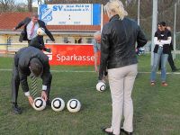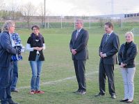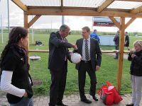 Der Sparkassenvorstand hatte Fußbälle mitgebracht, die er selbst mit Zahlen beschriftet hatte. Das Ganze war eine etwas andere Idee für eine symbolische Scheckübergabe. Vor dem Schild der Sparkasse richtete er, unter genauer Beobachtung von Birgit Pelke die Bälle aus, die nebeinander aufgereiht, die Spendensumme zeigten. Der Oberbürgermeister war unterdessen auch nicht untätig und balancierte die Bälle wie ein wahrer Ballzauberer heran.
