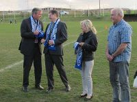 Nach den kurzen Ansprachen verteilte der Vorsitzende des SV Blau-Weiß 90 Hochstedt e.V. Fan-Schals an die Geldboten.