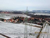 Ganz besondere Ansichten Hochstedts boten sich ab gegen Ende Januar 2014 denjenigen, die Arbeit an den Masten der 380 kV-Leitung hatten. Die Monteure, die an den Hochspannungskabeln mittels Arbeitsgondeln hin und her fuhren, konnten Hochstedt aus für uns vollkommen unbekannter Perspektive sehen. Einer von ihnen fand sich bereit einige Bilder zu machen, um auch andere an diesem Anblick teilhaben zu lassen. Herzlichen Dank dafür!
