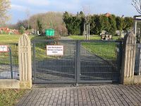 Die Stäbe im Zusammenhang mit dem Warnschild vor dem Betreten auf eigene Gefahr am Tor mutet an wie ein Firmengelände oder Industriegebiet, welches eingezäunt wurde. Beides hätte dezenter oder in einem anderen Design verbaut werden können, war aber sicher die billigste Lösung für die Stadt mit den klammen Kassen. Aber: Hier draußen sieht das ja keiner!