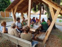 Die Palette der Speisen zog sich von Pizzen aus dem Nachbarort bis hin zu selbstgebackener Torte. Als es dann im Oktober kühler wurde, bekam die Minzebank ganz einfach einen Mantel.