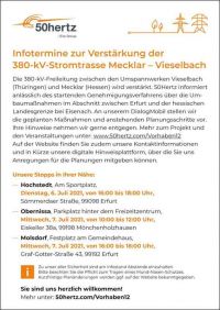 Die Firma 50hertz hatte am 6. Juli 2021 an ein Informations-Mobil am Sportplatz eingeladen. Angesprochen waren alle Hochstedter Einwohner, die Fragen bezüglich der Leitungsverstärkung der bestehenden 380 kV-Leitung vom Umspannwerk Vieselbach bis Mecklar in Hessen - Länge insgesamt 130 km - hatten oder sich einfach nur informieren wollten.