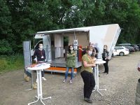 Die Mitarbeiter vor Ort hatten Informationsmaterial ausgelegt und Karten an Pinnwänden befestigt. Nach der wegen der Pandemie obligatorischen Registrierung der Anwesenden und dem Maskieren (im Freien! - eine Auflage vom Ordnungsamt) wurden Fragen beantwortet.