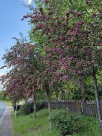 Es wurde höchste Zeit für den Rückschnitt der Rotdorn-Bäume an der Sömmerdaer Straße. Die Kronen der Bäume waren bereits so in die Breite gewachsen, dass sie an den Fassaden der Häuser kratzten, sobald der Wind ins Spiel kam denn der letzte Rückschnitt lag bereits mehrere Jahre zurück. In der Woche vom 19. bis 23. Mai 2025 wurden zumindest die Bäume des nördlichen Abschnitts der Straße zurückgeschnitten, während die des südlichen Abschnitts am Bürgerhaus noch in voller Blüte standen.