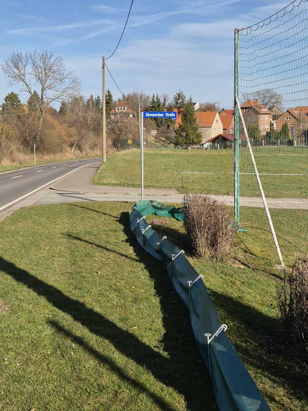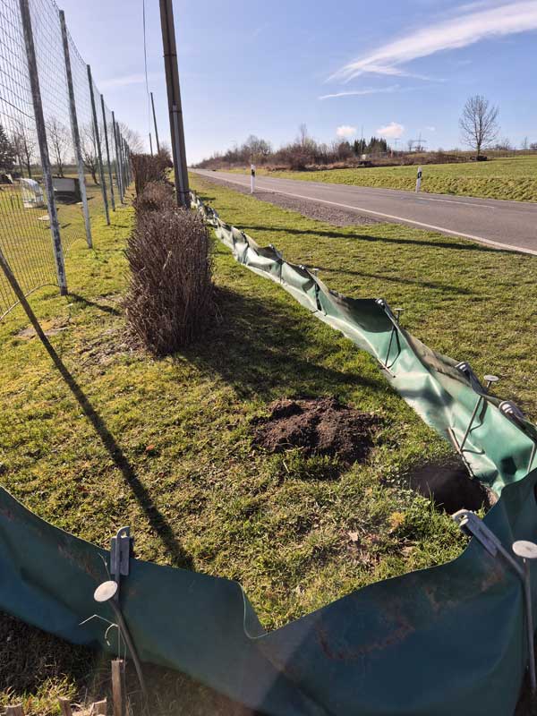Wie in den vergangenen Jahren auch, wurden entlang der Sömmerdaer Straße und der Heinrich-Quefa-Straße Schutzzäune für Amphibien aufgebaut. Es war gegen Ende Februar und Anfang März bereits so mild, dass die Krötenwanderung einsetzte. Direkt am Zaun waren wieder Eimer im Boden versenkt worden, worin die Tiere bis zu ihrer Rettung und sicherem Transport über die Straße verharren mussten.