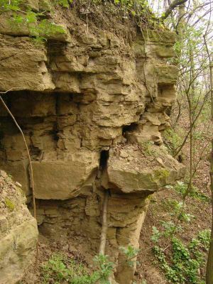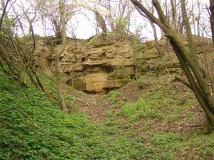 Unten: Skizze vom "Großen Steinbruch", wie er in der Vergangenheit ausgesehen hat. Der Mutterboden des Hügels wurde abgetragen und zusammen mit kleineren Bruchstücken der Sandsteine als Abraum links und rechts aufgetürmt. Mit Pferdegespannen wurden dann die Steine zum Dorf transportiert. Dies dürfte über den Weg hinter dem Steinbruch und dann durch die "Hohle" geschehen sein.