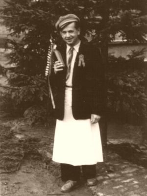 Burschenvater, wahrscheinlich Werner Heiter. Alle drei Bilder gehören zu einer Serie, die gegen Ende der 150er Jahre entstanden sein dürften. Beim Gasthaus mit den Fichten handelt es sich höchstwahrscheinlich um die Gaststätte "Zur Tanne" am Ortsausgang in Richtung Vieselbach.