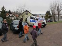 Auch am Ostermontag des Jahres 2012 gab es einen Protestmarsch der Gegner der 380 kV-Trasse, die durch Thüringen führen soll. Diesmal war es die Stadt Großbreitenbach, wo die Trassengegner ihrem Protest ausdruck verleihen wollten. Als Startpunkt war die Zweifelderhalle ausgemacht worden. Das Wetter meinte es in diesem Jahr jedoch nicht so gut mit den Demonstranten wie etwa vor zwei Jahren, denn ein recht kalter Wind wehte hier oben, unweit der Stelle wo nach Willen des Trassen--Erbauers 50 Hertz eine Schneise durch den Thüringer Wald geschlagen werden soll.