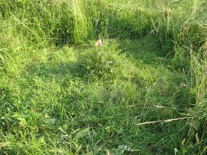 Kurz bevor die "Grasrasur" beginnen sollte wurde kontrolliert ob die Markierungen noch vorhanden waren. Natürlich war das nicht der Fall - die Stöcker waren harausgerissen und weggeworfen worden. Deshalb wurde nun die Stelle, an der die Distel wuchs mit der Grasschere kurz geschnitten und die Silberdistel somit freigelegt.