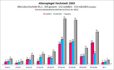 Das folgende Diagramm gibt eine Übersicht über die Altersstruktur der Hochstedter Einwohner im Jahr 2003. Der Stichtag für die Ermittlung der Daten war der letzte Tag des Jahres, also der 31.12.2003.
