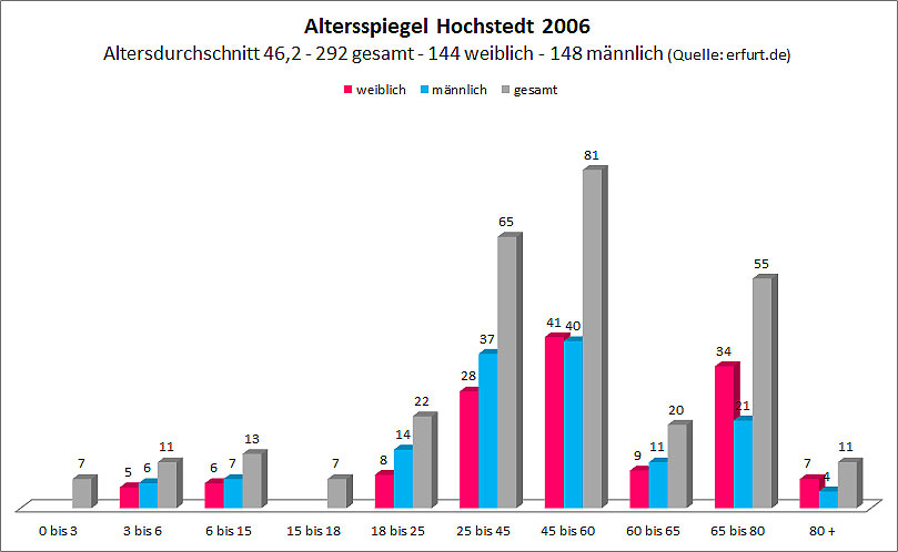 Das folgende Diagramm gibt eine Übersicht über die Altersstruktur der Hochstedter Einwohner im Jahr 2006. Der Stichtag für die Ermittlung der Daten war der letzte Tag des Jahres, also der 31.12.2006.