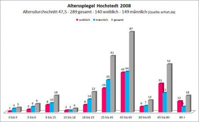 Das folgende Diagramm gibt eine Übersicht über die Altersstruktur der Hochstedter Einwohner im Jahr 2008. Der Stichtag für die Ermittlung der Daten war der letzte Tag des Jahres, also der 31.12.2008.
