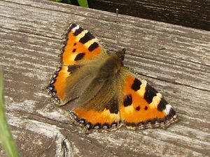 Der zur Familie der Edelfalter gehörende Kleine Fuchs (Aglais urticae) beim "Sonnenbad" auf einer Bank im "Bach" am 12. Juni 2005. Als Raupe vertilgt er bevorzugt Brennnesseln.