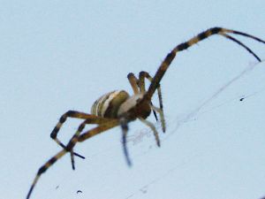 Eine Wespenspinne (Argiope bruennichi) hatte am 22. Juli 2006 ihr Radnetz gesponnen. Auffällig war ihr gelb-weiß-schwarz gestreifter Hinterleib und die gestreiften Beine. Durch ihre Musterung gilt sie als eine der schönsten Spinnen überhaupt. Dieses Weibchen hatte schon eine stattliche Größe erreicht. Übrigens: die Männchen der Wespenspinne werden während Paarung eingesponnen und danach verzehrt.