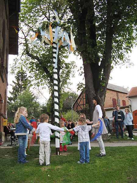 Begeistert drehten sich die Kinder um den Maibaum, während über ihnen die bunten Bänder flatterten.