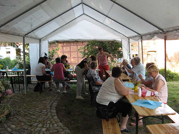 In der Mitte der Zelte stand ein großer Sommerblumenstrauß und auf den Tischen kleine Sträußchen. Schon im Mai waren Einladungen an Nicht-Vereinsmitglieder herausgegangen, da wir uns auf diesem Weg für ihre Hilfe bedanken wollten.