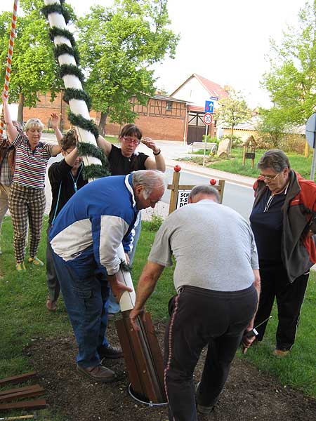 Das Maibaumsetzen 2011 fand ganz im Zeichen der neu installierten Hülse am Bürgerhaus statt. Diese war Voraussetzung, dass überhaupt ein Maibaum aufgestellt werden durfte. Die Stadtväter hatten bemängelt, dass unsere erst vor einigen Jahren in die Erde gebrachte Hülse nicht irgendeiner DIN entsprach und dementsprechend nicht sicher sei. Wenige Wochen vor dem Aufstell-Termin gab es daher eine neue Hülse, die freundlicherweise von der Firma EUROVIA, die im Ort das Einlaufbauwerk für das Regenrückhaltebecken in den Boden gebracht wurde.
