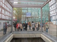 Eine Treppe führte noch weiter nach oben. Diese war von ihrer Steilheit her auch nicht zu verachten. An ihrem Ende gelangten wir zu einem gläsernen Überbau. Durch die Scheiben konnte man die Reste einer mittelalterlichen Synagoge sehen, die bei Ausgrabungen freigelegt worden waren.Die Stadtführerin freute sich, dass wir etwa 10 Minuten später dran waren und wir erst jetzt zum Marktplatz mit dem Rathaus kamen. Es war kurz vor 12.00 Uhr Mittag und gleich sollte die Marburger Rathausuhr mit ihrem Programm beginnen. Unterhalb des Ziffernblatts steht die Göttin der Gerechtigkeit, Justitia, mit der Waage. Der Wächter mit der Trompete steht links und der Tod mit dem Stundenglas rechts davon. Oberhalb der Uhr ist die Kugel, die Tag und Nacht anzeigt. Wenn der Rathausgockel zu jeder vollen Stunde mit den Flügeln schlägt, dann ist es nicht dieses Federvieh, das kräht, sondern der Wächter, der trompetet, so klärte uns die Stadtführerin auf.
