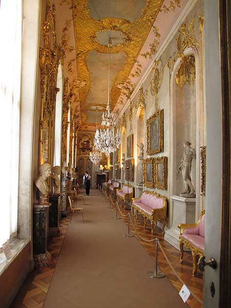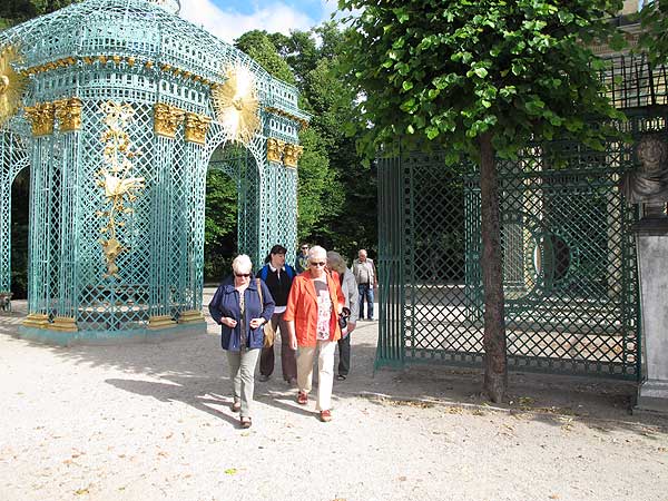 Diese Mühle befindet sich in unmittelbarer Nähe zum Schloss, das wir besichtigen wollten. Nach wenigen Minuten hatten wir den langgestreckten Bau auf dem Gipfel des königlichen Weinbergs erreicht. Zunächst konnte jedoch die Keramikausstellung besucht werden, was nichts anderes bedeutete als dass man die Toiletten aufsuchen konnte. Kurz darauf begann dann der Rundgang im Schloss Sanssouci. Der Name bedeutet auf französisch "Ohne Sorge" und sollte dies wohl für seinen Erbauer hauptsächlich ausdrücken. Es wird als das preussische Versailles bezeichnet. An das bei Paris liegende Schloss des Sonnenkönigs Ludwig XIV reicht Sanssouci jedoch nicht heran. Potsdams Geschichte als Residenzsstadt dauerte von 1660 unter Friedrich Wilhelm dem Großen über dreihundertfünfzig Jahre an, bis zur Abdankung Kaiser Wilhelm II. nach dem Ersten Weltkrieg.