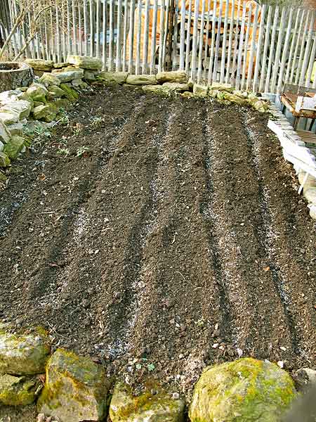 Schnell war die Erde auf dem Beet geglättet und Rillen für die Saat gezogen. Der Tag war recht windig und die trockenen Samenschoten würden vom Wind fortgetragen, wenn nicht etwas Erde den Samen bedecken würde.