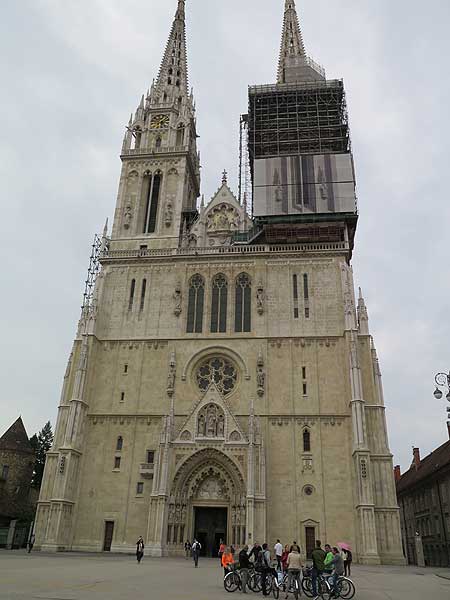 Wir folgten, der vorgeschriebenen Erkundungstour durch das Areal mit Bauten aus dem Historismus (1860-1900) und dem Jugendstil. Es ging vorbei an der prächtigen Fassade des Nationaltheaters und an zahlreichen Museen und Galerien. Inzwischen waren die ersten Tropfen vom Himmel gefallen. Wir erreichten das Stadtzentrum mit dem Ban-Jelaćič-Platz, der die Oberstadt mit der Unterstadt verbindet. Er entstand im 17. Jahrhundert als neuer Marktplatz. Von hier gingen wir zur Oberstadt hinauf, wo die mächtige Kathedrale Zagrebs, mit Namen "Kathedrale der Himmelfahrt der seligen Jungfrau Maria" steht. Ehemals war die Kathedrale unter der Bezeichnung Stephansdom bekannt. Einer der beiden Türme war eingerüstet, wie sich schnell herausstellen sollte aus gutem Grund.