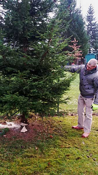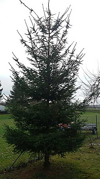 Am 28. November, dem Vortag zum 1. Advent, war es schon wieder an der Zeit, den Hochstedter Weihnachtsbaum aufzustellen und zu schmücken. In diesem Jahr hatten wir Sorge, einen geeigneten Baumspender zu finden. Auch in Hochstedt gab es viele von der Sitkafichtenlaus befallene Blaufichten, von denen einer eigentlich als Kandidat für den Weihnachtsbaum vorgesehen war. Trotzdem fanden wir eine Tanne, die unseren Vorstellungen entsprach. Wir hatten uns hinter dem Sportplatz getroffen, um von dort den zukünftigen Weihnachtsbaum 2015 zum Bürgerhaus zu bringen. Ruck-zuck war die Säge angesetzt und der Baum konnte seine kurze Reise beginnen. Bis zum Bürgerhaus war die Fahrzeit mit dem Traktor nicht allzu lange, so dass die Strecke in wenigen Minuten bewältigt war und der Baum am Ziel abgeladen werden konnte.