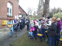 Nachdem die letzte Kugel am Baum hing, ging es gemeinschaftlich ans Singen. Die Ortsteilbürgermeisterin, Silke Palmowski begleitete den "Hochstedter Weihnachtschor" mit der Gitarre. Wie immer bei solchen oder ähnlichen Anlässen kam die Liedermappe zum Einsatz, die eine Sammlung von Liedern enthielt, die zu einigen öffentlichen Veranstaltungen immer mal wieder gesungen wurden. Wer nicht so textsicher war, konnte so trotzdem mitsingen. Inzwischen war auch die Landtagsabgeordnete Karola Stange eingetroffen, die immer gerne auch zum Weihnachtsbaumsetzen vorbei schaut. Auch sie hatte eine Liedermappe und stimmte in unseren Gesang ein.