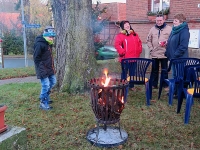 Selbstverständlich gab es Glühwein, Grog und Kinderpunsch, denn wenn auch kein Schnee lag, wurde es doch mit der Zeit kühl. Mit der Dämmerung funkelte dann bald auch unser Weihnachtsbaum mit seinen vielen Lichtern. Wir waren guter Laune, wärmten uns äußerlich am Feuerkorb und innerlich mit den heißen Getränken. Am Abend begannen wir mit den Aufräumarbeiten, die nicht allzu lange dauerten. Als alles wieder an seinem Platz stand, machten wir uns auf den Heimweg.